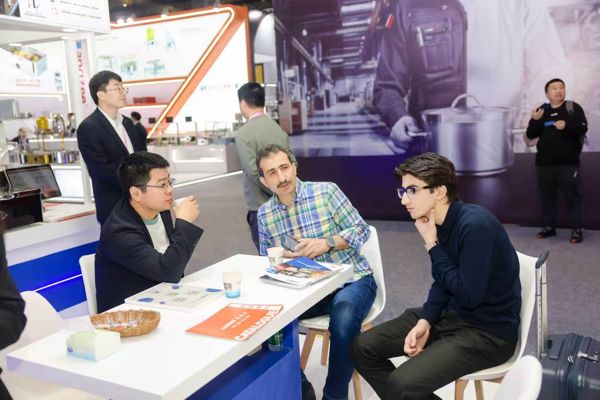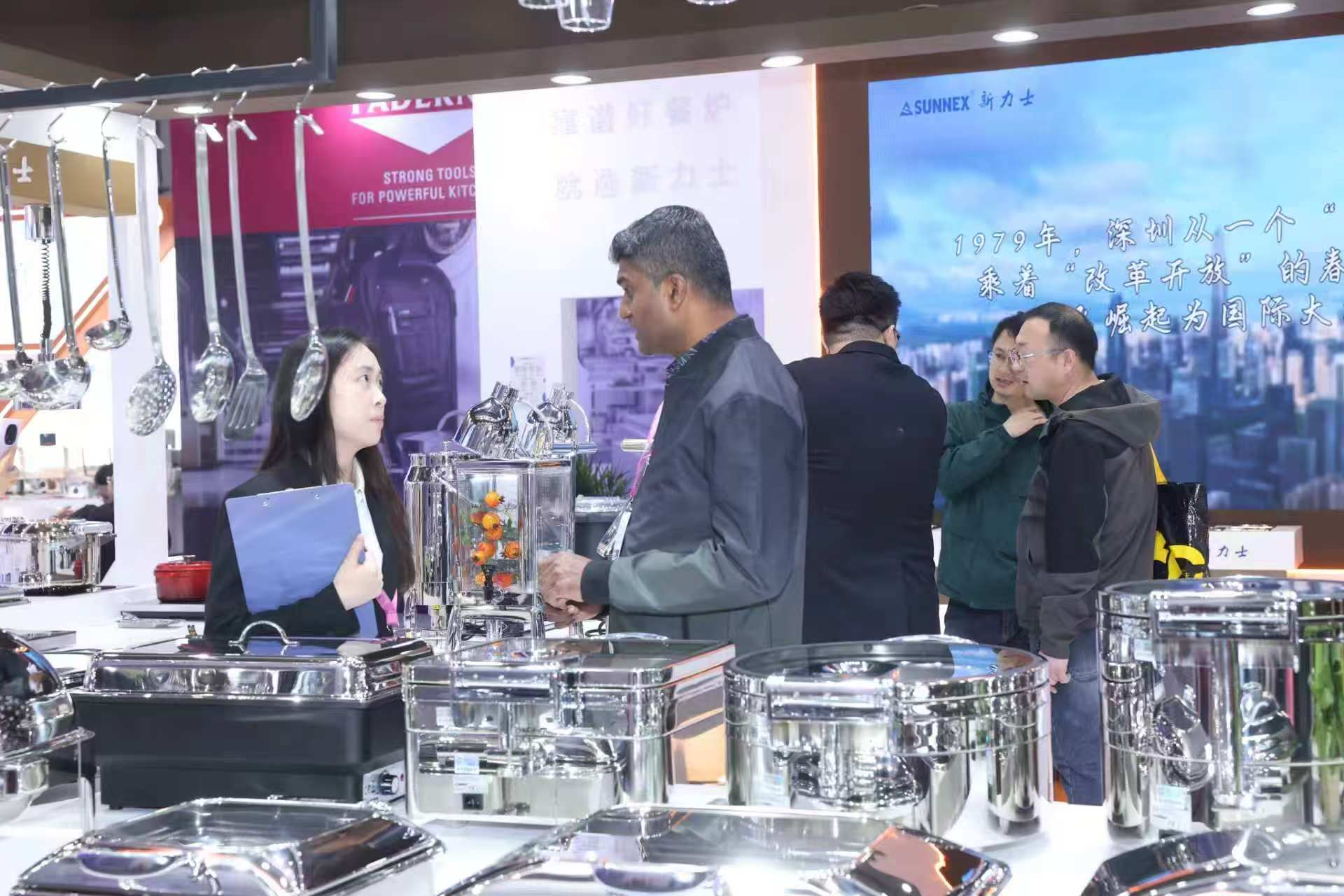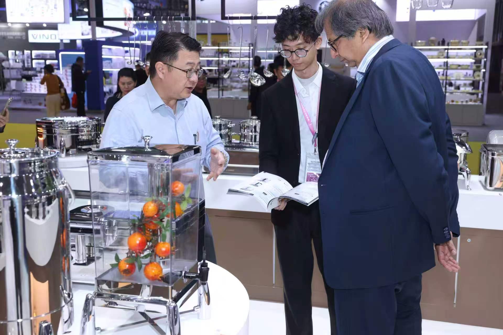 प्रदर्शनीमा, ब्रान्डले पानी रहित सुख्खा चाफिङ डिश, क्लासिक स्टेनलेस स्टील ग्यास्ट्रोनर्म प्यान, भेरोना सिरिजको दुधको कलश, आइस-ट्युब बेभरेज डिस्पेन्सर र अन्य नयाँ उत्पादनहरू, उच्चस्तरीय होटल, चेन क्याटरिङ ब्रान्ड र स्टाफ क्यान्टिनहरूको विभिन्न आवश्यकताहरू पूरा गर्ने लगायत बेस्टसेलर प्रदर्शनमा केन्द्रित रहेको थियो। हाम्रो बुथले मध्य पूर्व, अफ्रिका, युरोप, अमेरिका र दक्षिणपूर्व एशिया भरका व्यावसायिक विदेशी खरीददारहरूबाट निरन्तर भ्रमणहरू प्राप्त गर्यो। हाम्रो व्यावसायिक टोलीले गहिरो सहयोग छलफलको लागि एक-एक-एक उत्पादन परिचय र अनुकूलित समाधान समर्थन प्रदान गर्यो।